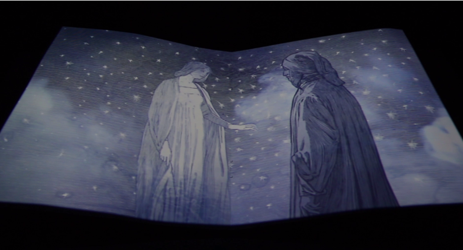 Nove sale in tutto e tra queste, quasi uno spettacolo a sé, quella dedicata alla Divina Commedia. Si tratta di una sala immersiva con al centro un grande volume aperto e animato da proiezioni. I passi più significativi della Divina Commedia, letti da Francesco Pannofino, accompagnano lo sfogliarsi delle pagine, immergendo il visitatore in un viaggio tra le cantiche mano nella mano con il Poeta.