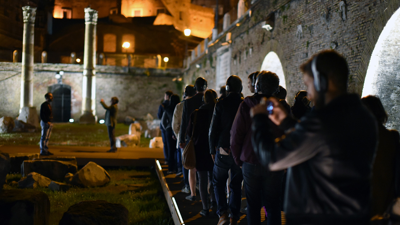 Gli spettatori sono accompagnati in un insolito percorso notturno dalla voce di Piero Angela, mentre magnifiche ricostruzioni proiettate in video-mapping sulle rovine mostrano i luoghi così come si presentavano nell’antica Roma.
